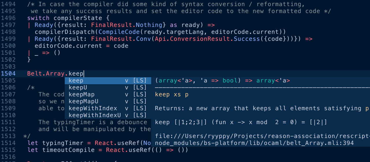 For VSCode, install rescript-vscode in your editor. For vim, install our vim-rescript extension and configure it with your preferred setup (plain vim or with coc-vim).